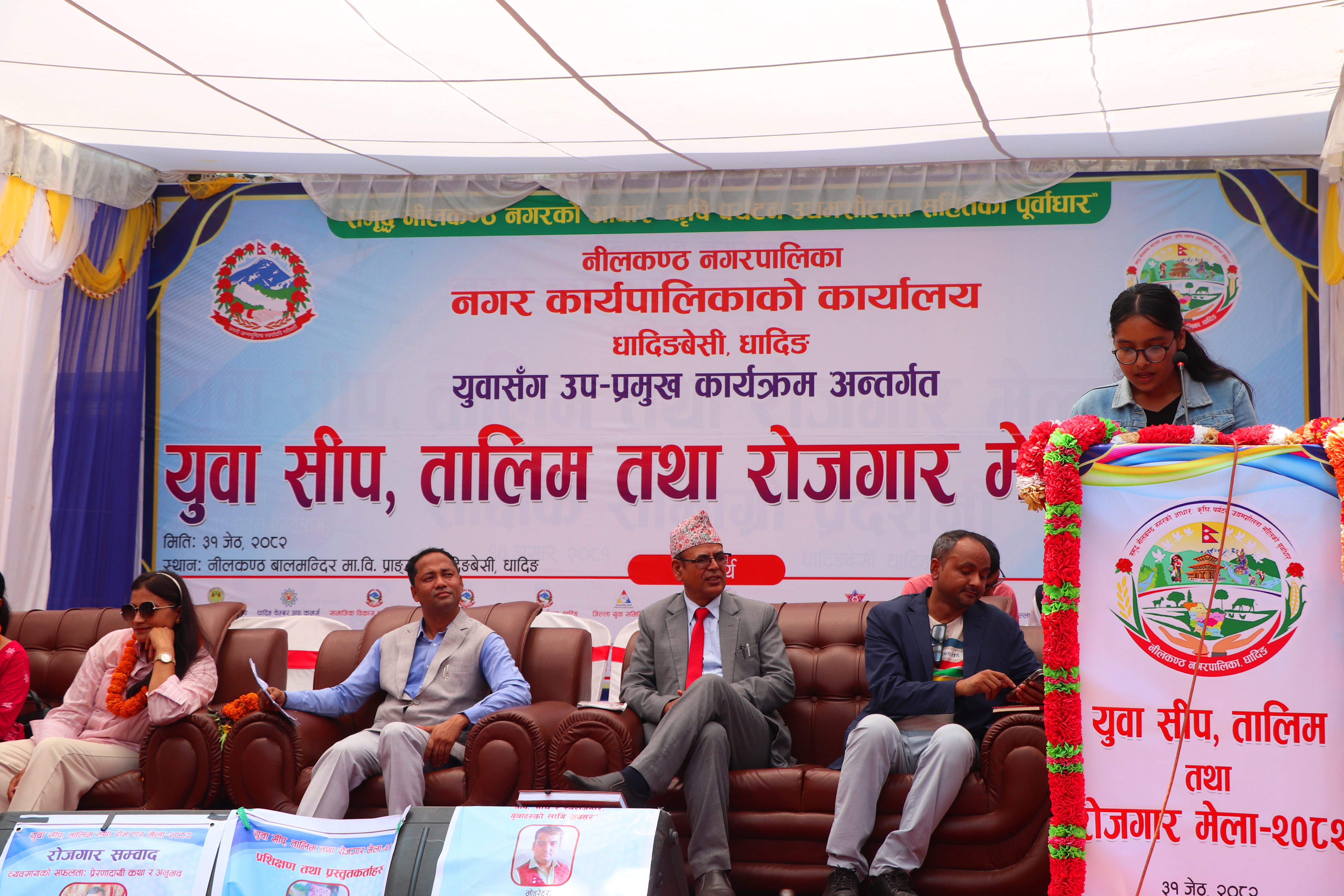 नीलकण्ठ वालमन्दिर माध्यामिक विद्यालयको प्रागणमा भएको मेलामा नीलकण्ठ नगरपालिकाका नगर प्रमुख एवम् नेपाल नगरपालिका महासंघका अध्यक्ष भीमप्रसाद ढुंगानाले नीलकण्ठ नगरपालिकालाई उद्यमशिलताको हव बनाउने बताउनुभएको छ । नीलकण्ठ नगरपालिकाका उप–प्रमुख दिपक विश्वकर्माले सीपलाई उद्यमशिलता, उत्पादन र श्रमसँग जोड्दै युवालाई रोजगारी दिन रोजगार मेला गरिएको बताउनुभयो ।