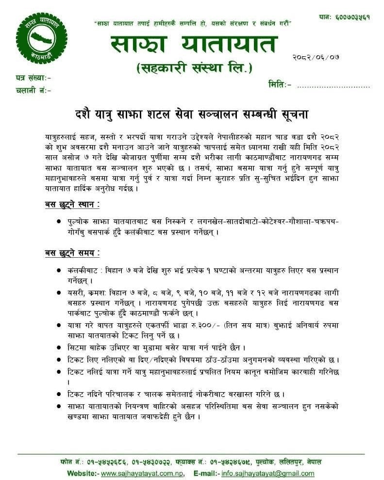 दशैँलाई लक्षित गरी साझा यातायात सहकारी संस्था लिमिटेडले चाडपर्वको अवसरमा घर फर्किने तथा बाहिर जाने यात्रुहरूलाई लक्षित गरी सस्तो, सहज र भरपर्दो बस सेवा सञ्चालन गरेको छ ।