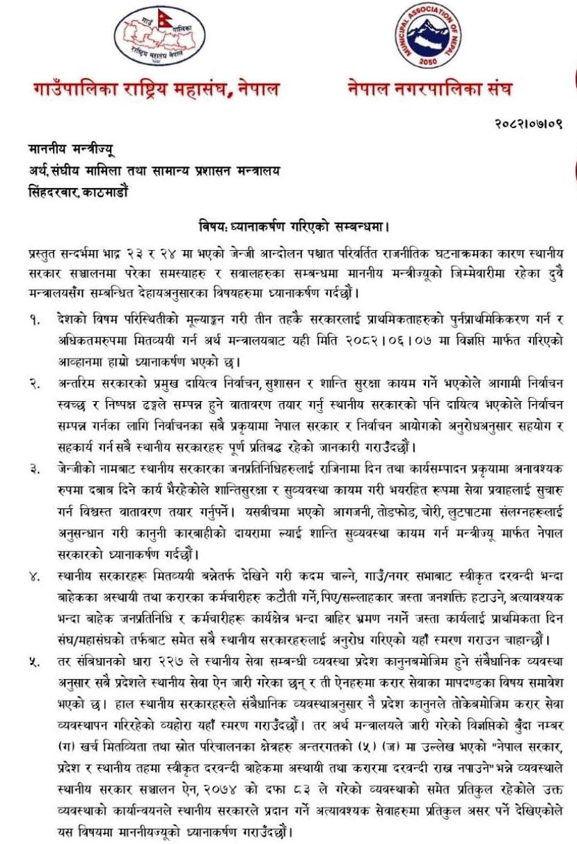 ध्यानाकर्षण पत्रमा स्थानीय सरकारहरूलाई मितव्ययी कदम चाल्न, अस्थायी/करार कर्मचारी र सल्लाहकार कटौती गर्न, अनावश्यक भ्रमण घटाउन र नीति–कार्यक्रम पुनःप्राथमिकीकरण गर्न सङ्घ/महासङ्घले गरेको अनुरोधलाई पुनः स्मरण गराएको छ । जेनजी आन्दोलनका नाममा जनप्रतिनिधिमाथि भइरहेका दबाब, आगजनी, तोडफोड, चोरीजस्ता गतिविधिहरूको रोकथाम गरी शान्ति–सुरक्षा कायम गर्न तथा दोषीलाई कानुनी कारबाहीको दायरामा ल्याउन माग गरिएको छ । तीन तहका सरकारबिचको समन्वय र स्वायत्तताको सम्मानका लागि अन्तरसरकारी वित्त परिषद्को बैठक शीघ्र आव्हान गर्न अनुरोध गरेको छ ।