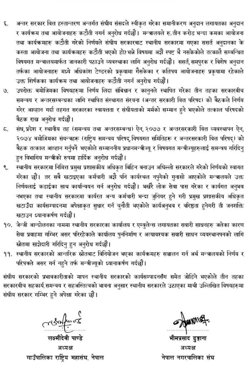 स्थानीय सरकारहरूको साझा छाता संस्था गाउँपालिका राष्ट्रिय महासङ्घ नेपाल र नेपाल नगरपालिका सङ्घले संयुक्त रूपमा आइतबार अर्थमन्त्री रामेश्वर खनाललाई ध्यानाकर्षण गराएका छन् ।