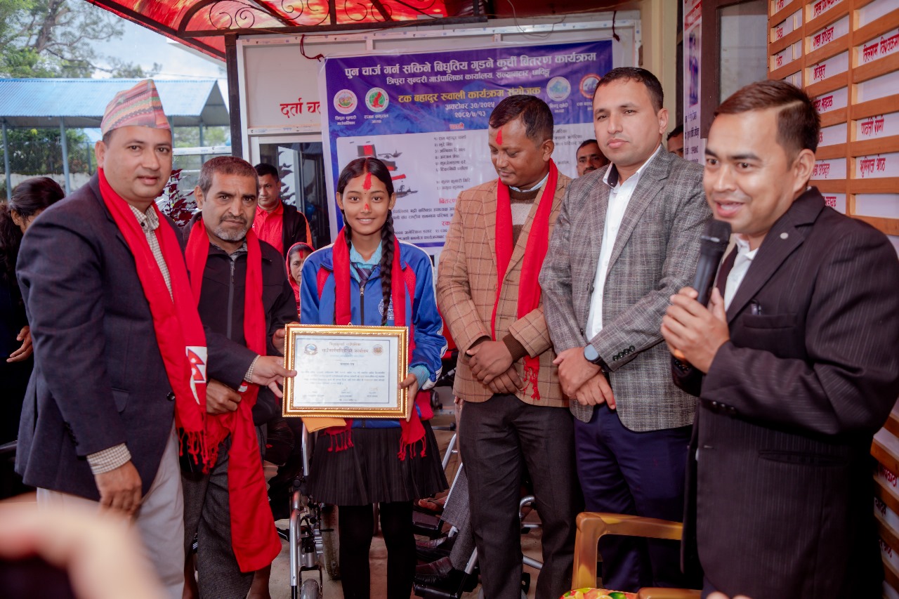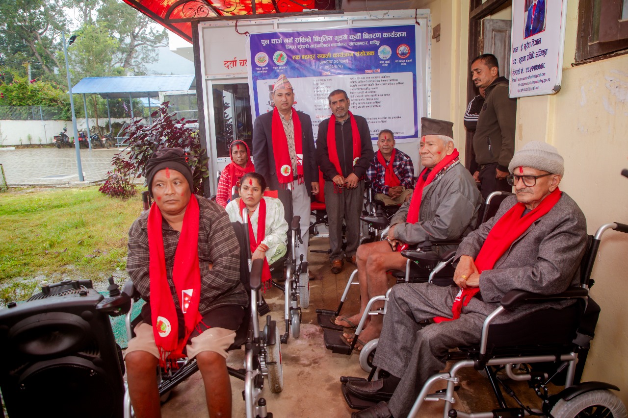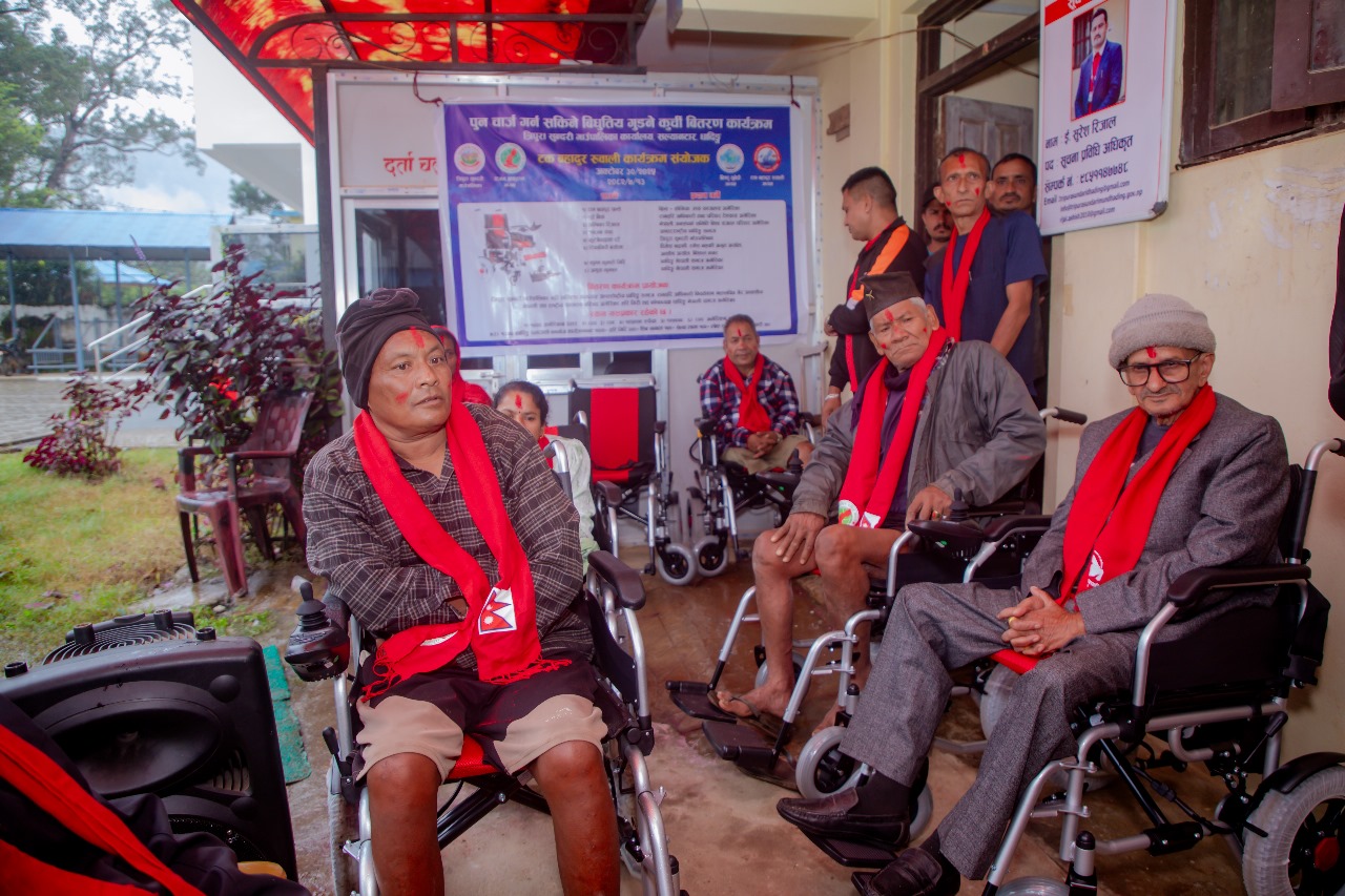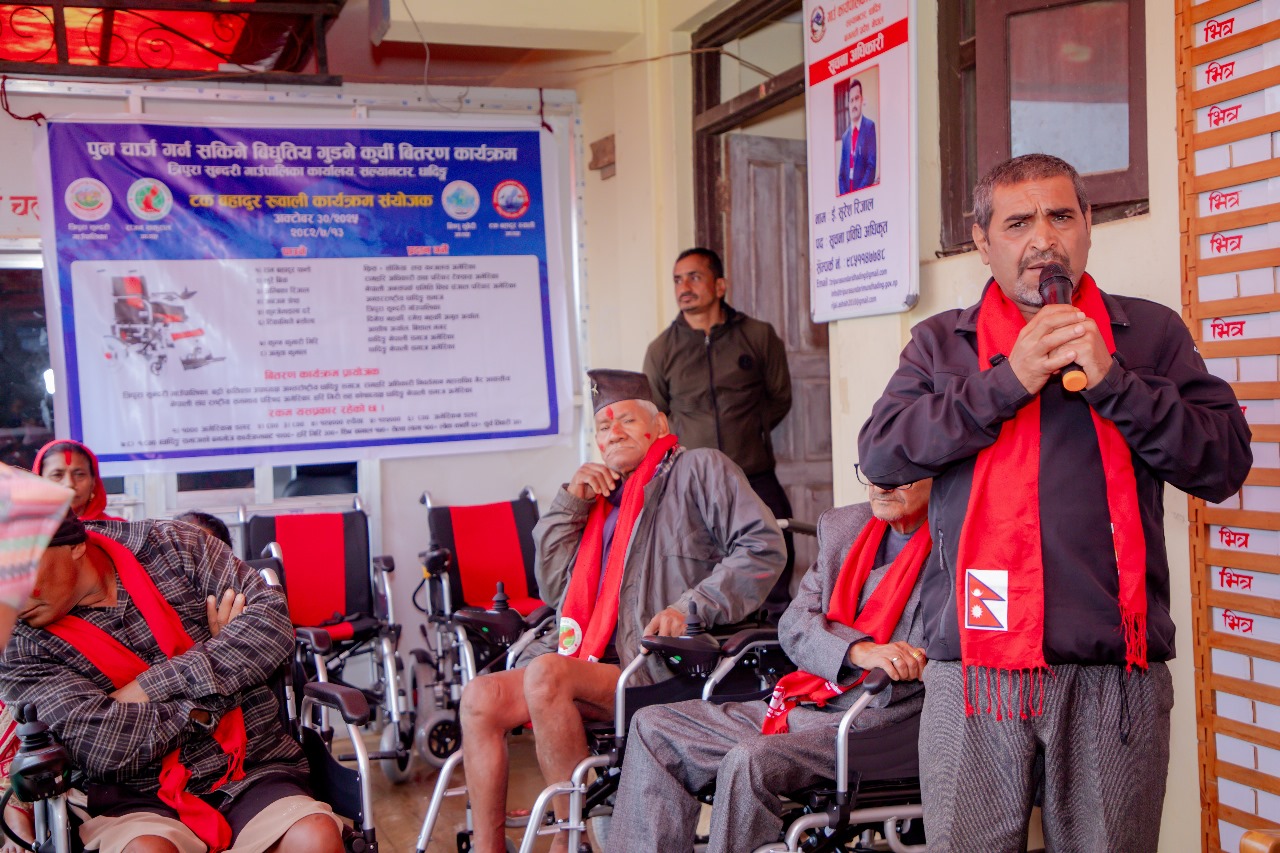 रिचार्जेबल ह्विलचियर वितरण गरेको हो । एक पटक चार्ज गरेपछि करिब १५ किलोमिटरसम्म आवतजावत गर्न सकिने र अरूको सहयोग बिना नै सहज रूपमा प्रयोग गर्न मिल्ने सुविधा सम्पन्न ह्विलचियरहरू वितरण गरिएको हो ।