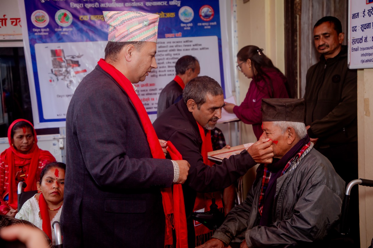 धादिङको त्रिपुरासुन्दरी गाउँपालिका–स्थित सल्यानटारमा अपाङ्गता भएका आठ जना व्यक्तिहरूलाई रिचार्जेबल ह्विलचियर वितरण गरिएको छ ।