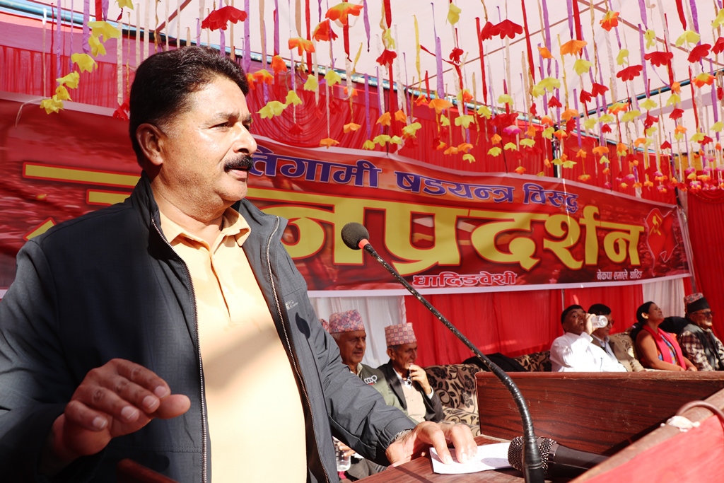 धादिङबेसीमा शनिबार प्रतिगामी षड्यन्त्रका विरुद्ध आवाज उठाउँदै, संविधान र लोकतन्त्रको रक्षा तथा संसद पुनस्थापनाको लागि एमालेले धादिङमा जनप्रदर्शन सम्पन्न गरेको छ ।