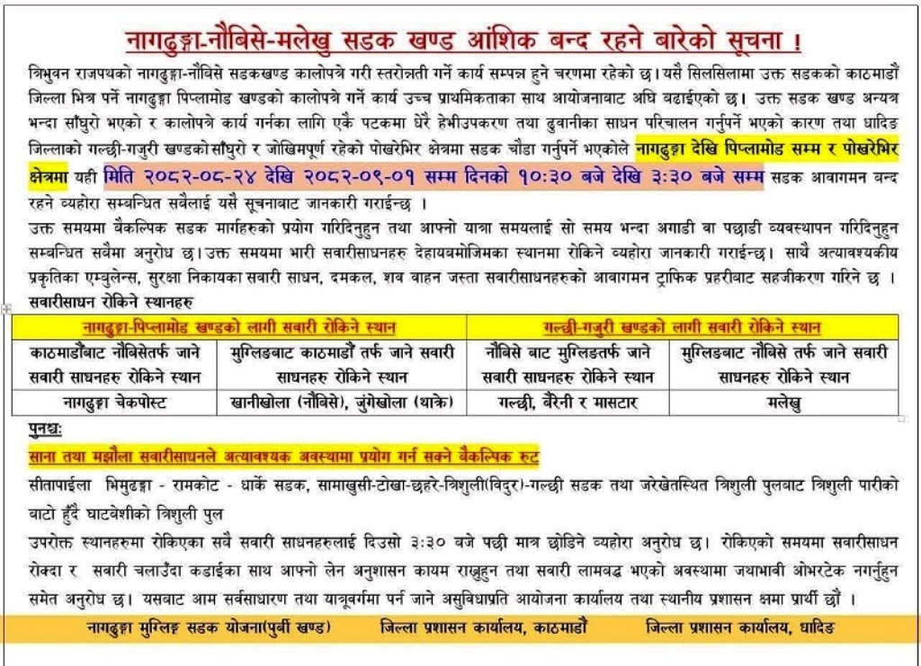 नागढुंगा–मलेखु सडकखण्ड अन्तर्गत पिप्लामोड तथा धादिङको पोखरेभीर क्षेत्रमा मंसिर २४ गतेदेखि पुस १ गतेसम्म दैनिक दैनिक ५ घण्टा सवारी आवागमन पूर्ण रूपमा बन्द गरिने भएको छ ।