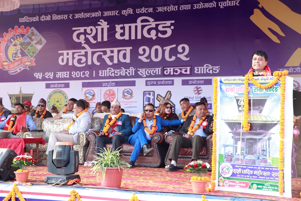 धादिङ जिल्लाको समग्र विकास र अर्थतन्त्र सुदृढ बनाउने उद्देश्यसहित ‘धादिङको दिगो विकास र अर्थतन्त्रको आधार, कृषि, पर्यटन, जलस्रोत र उद्योगको पूर्वाधार’ भन्ने मूल नाराका साथ दशौं धादिङ महोत्सव–२०८२ बिहीबारदेखि धादिङबेसीको खुल्ला मञ्चमा दशौं धादिङ महोत्सवसुरु भएको छ ।