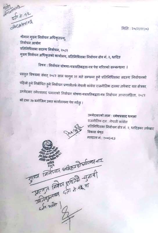आगामी फागुन २१ गते हुने प्रतिनिधि सभा सदस्य निर्वाचनमा सहभागी धादिङ क्षेत्र नं. २ का २४ जना उम्मेदवारमध्ये हालसम्म केवल ४ जनाले मात्रै प्रतिबद्धतापत्र कार्यालयमा बुझाएका छन् ।